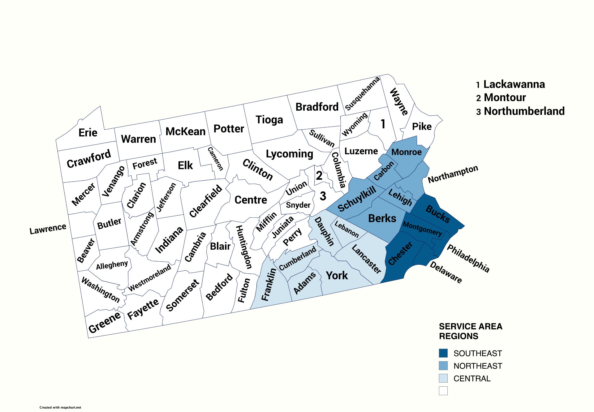 Northeast: Berks, Carbon, Lehigh, Monroe, Northampton, Schuylkill